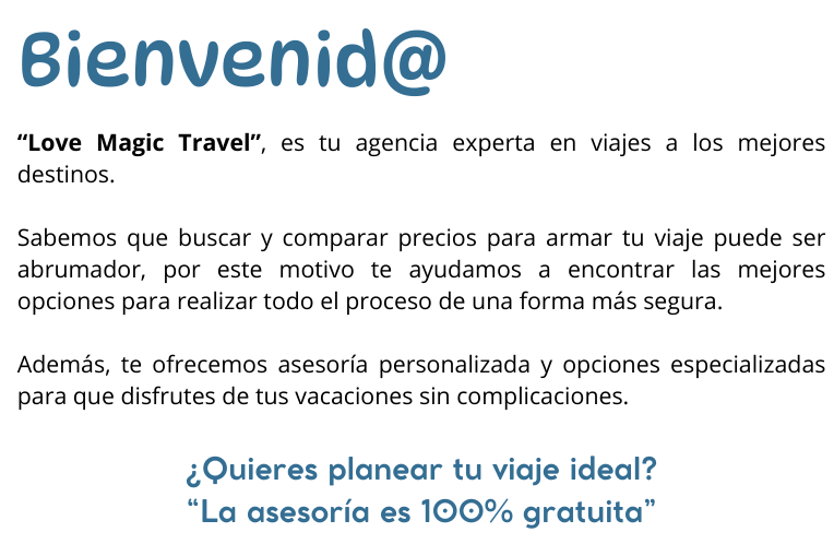 Servicios Desliza para descubrir más Navega y explora en el sitio web Acerca de Love Magic Travel Certificaciones 📜 Destinos 🌎 Preguntas Frecuentes ⁉️ Contacto 📞